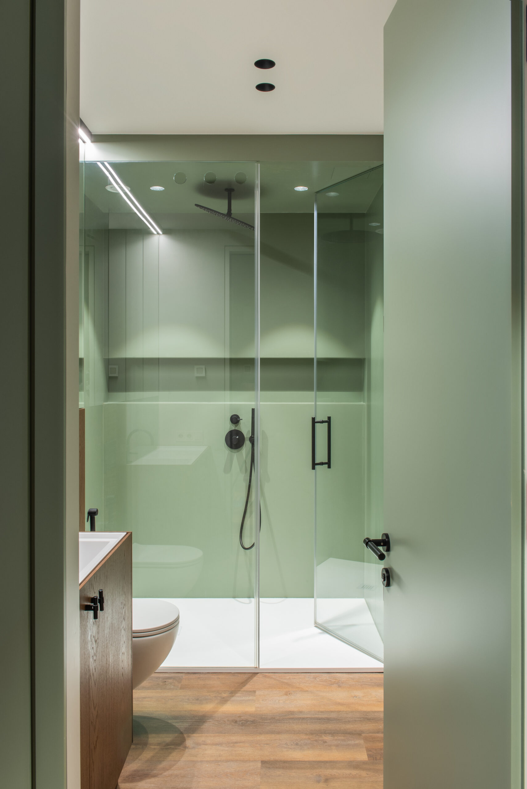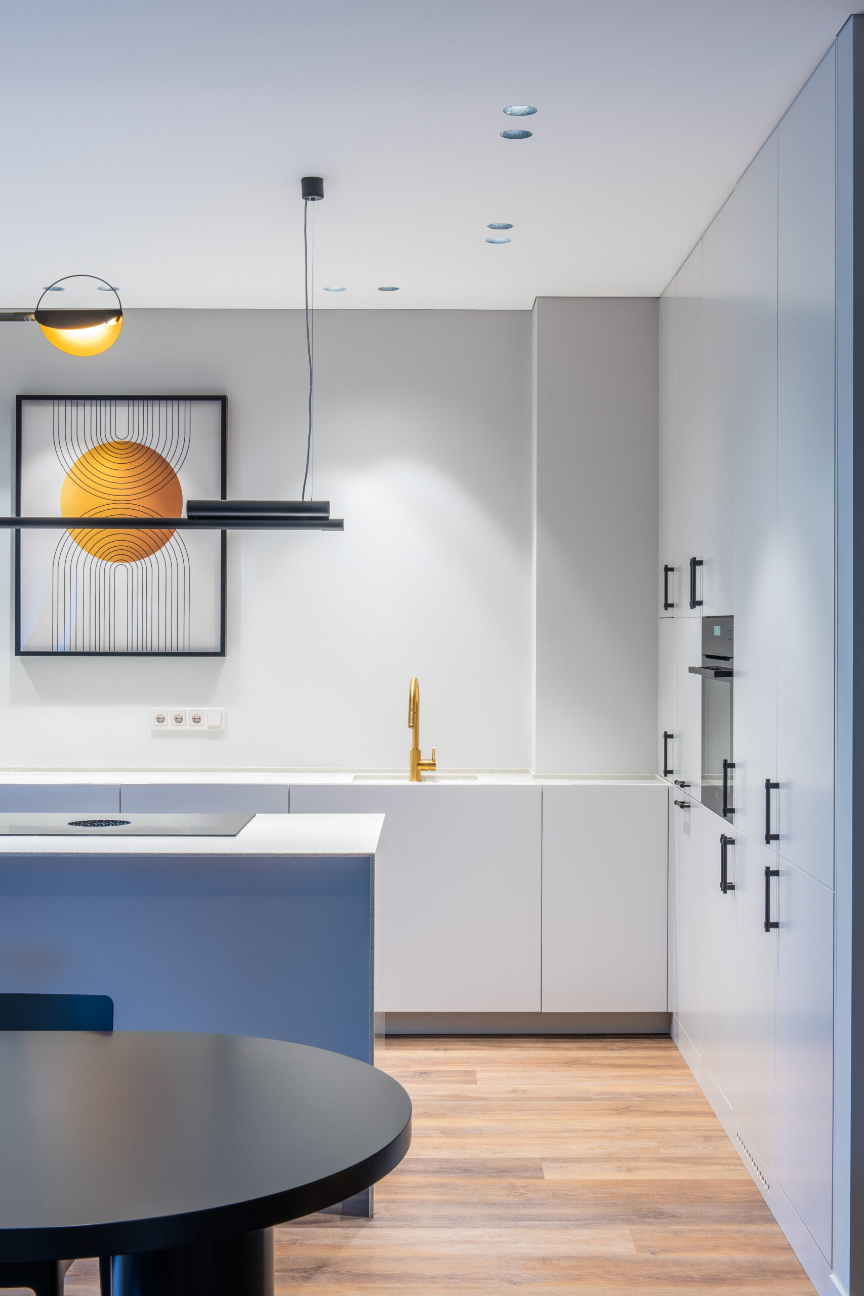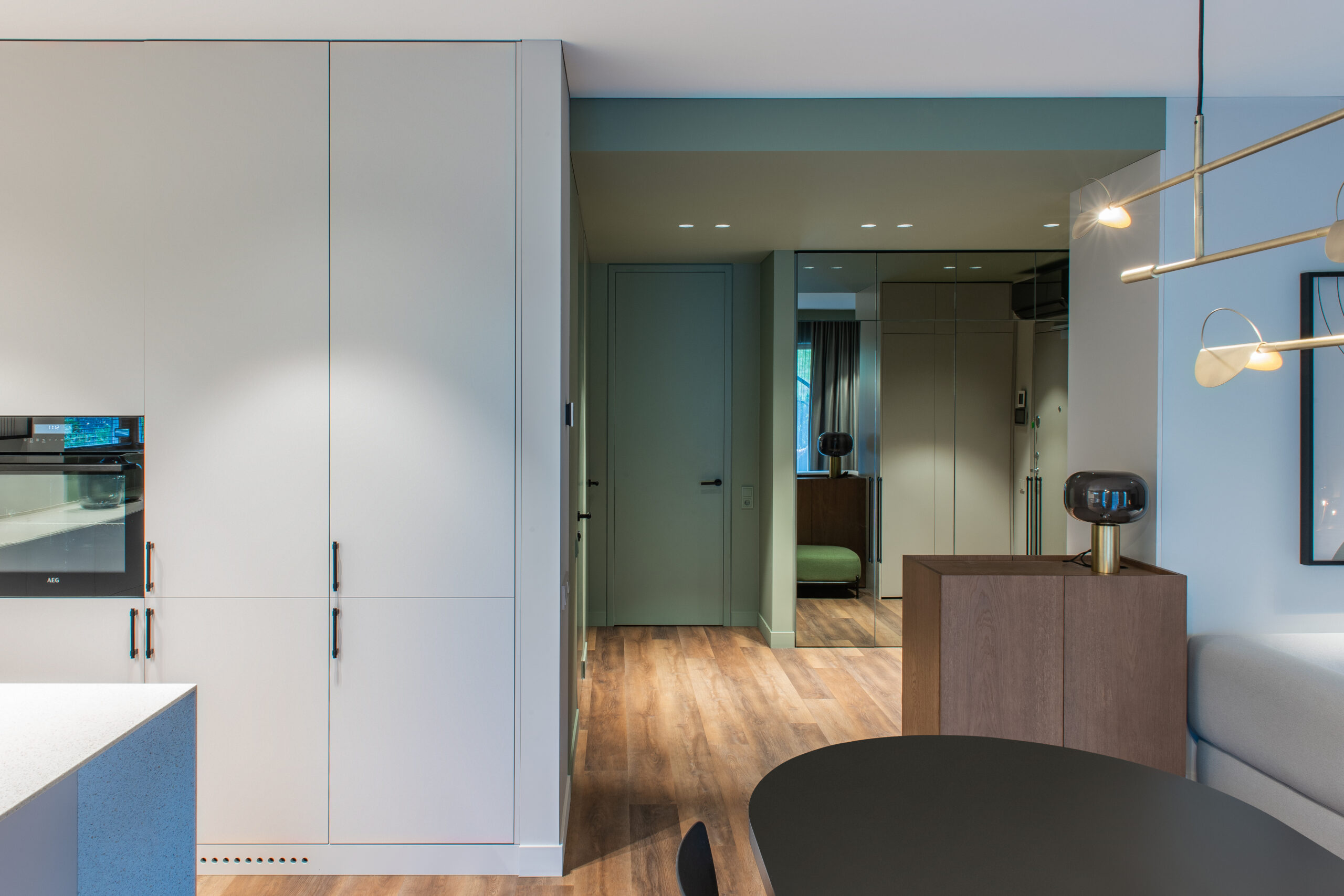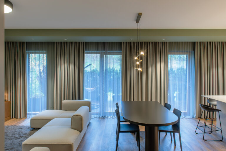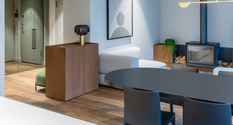 Jaunos šeimos būstas išpildytas taip, kad gyvybės jam pridėtų tik jame gyvenantys, svečiuojantys asmenys. Grindims pasirinkta Expona kolekcijos medžio imitacijos vinilinės lentelės.